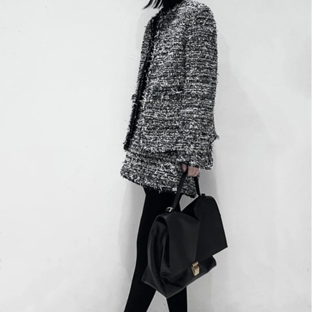 上品な印象を演出するツイード調ジャケットとミニスカートのツーピース。