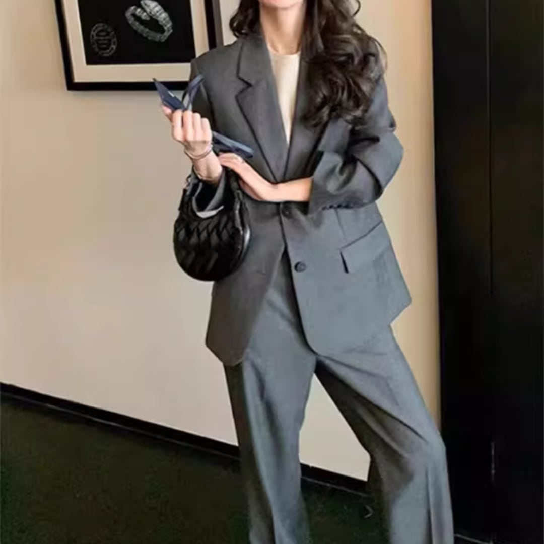 ダブルブレストが印象的なジャケットは、さっと羽織るだけでトレンド感のある着こなしに。オーバーサイズなので、中に厚手のニットを着込んでも快適です。