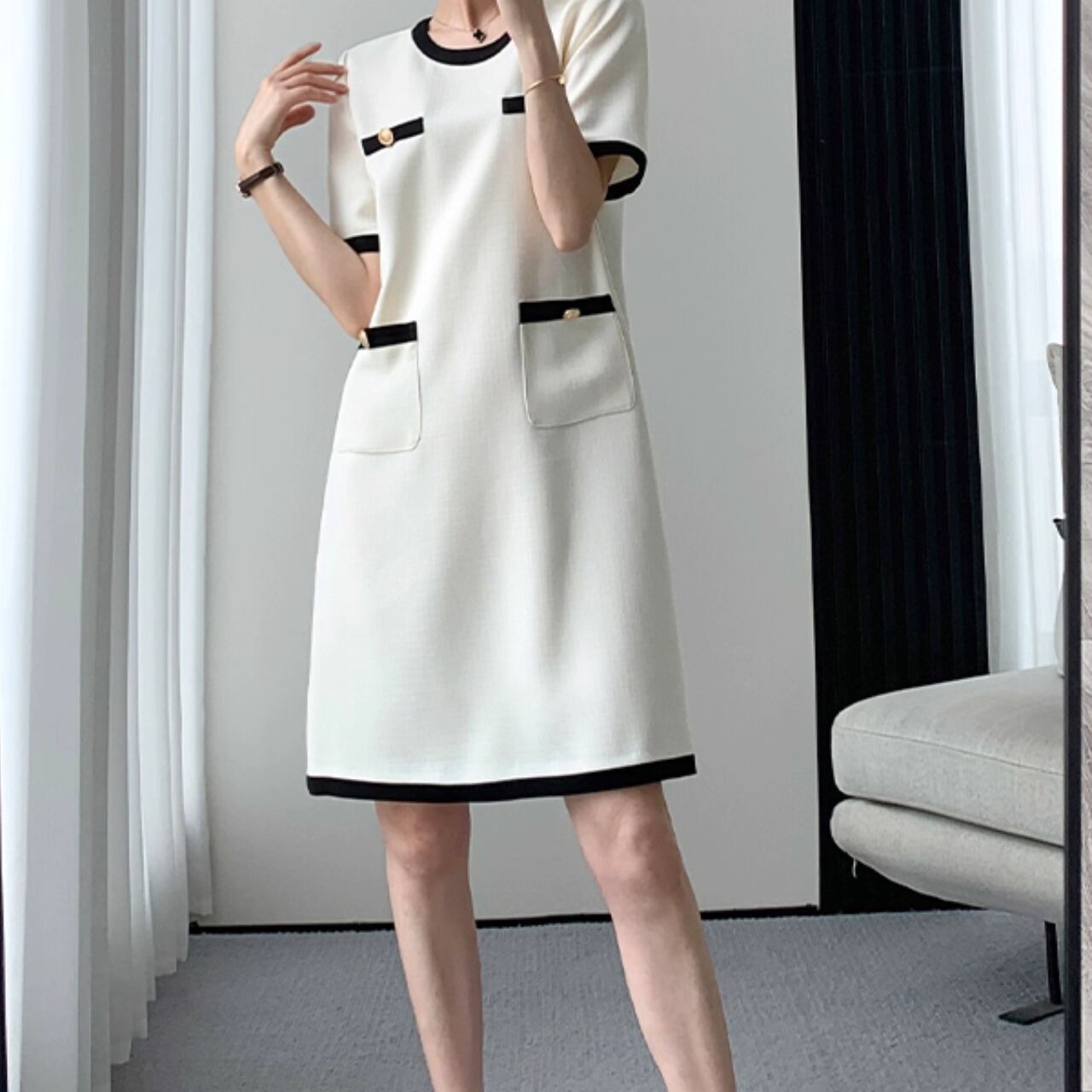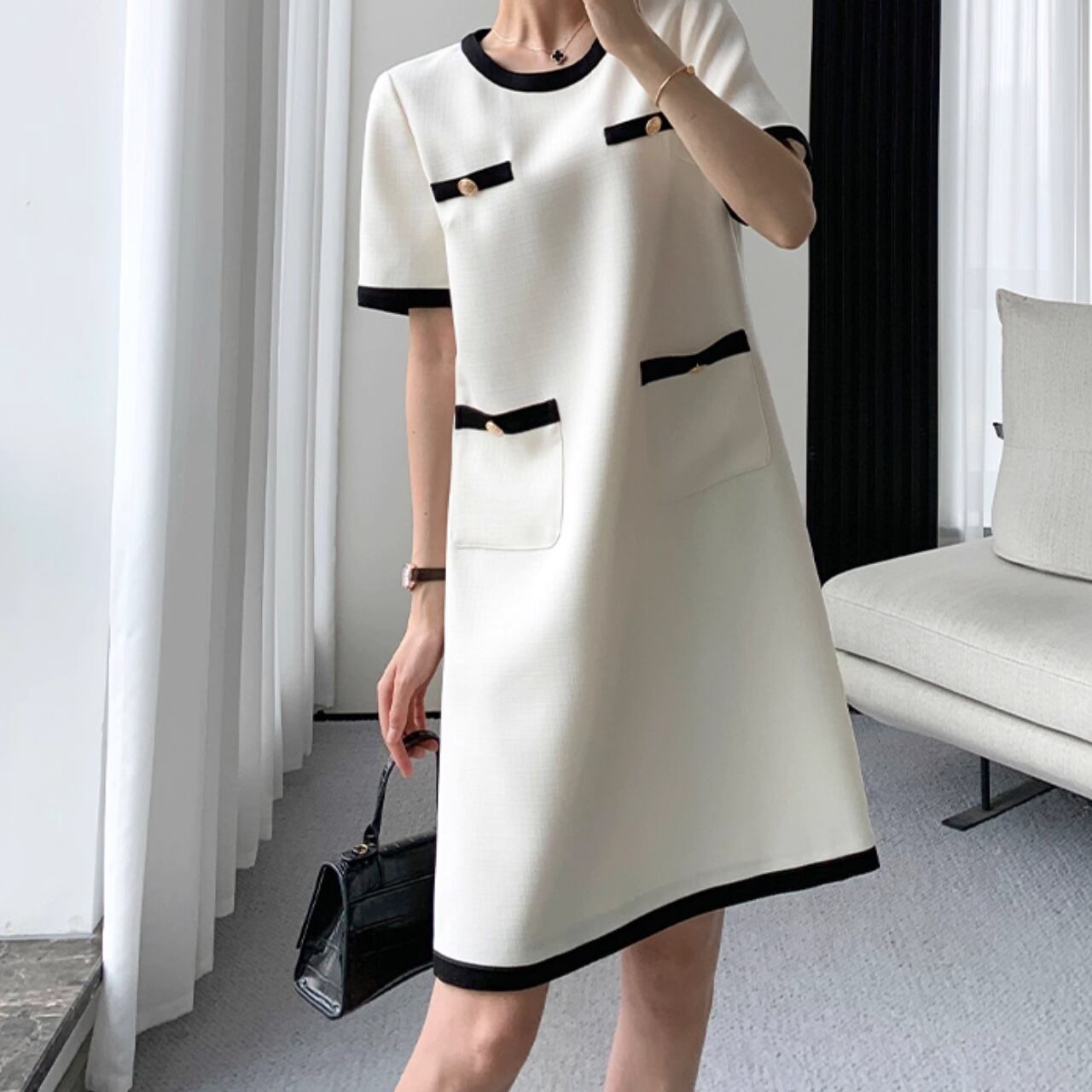 清楚で好印象な着こなしが叶う、パイピングワンピース。