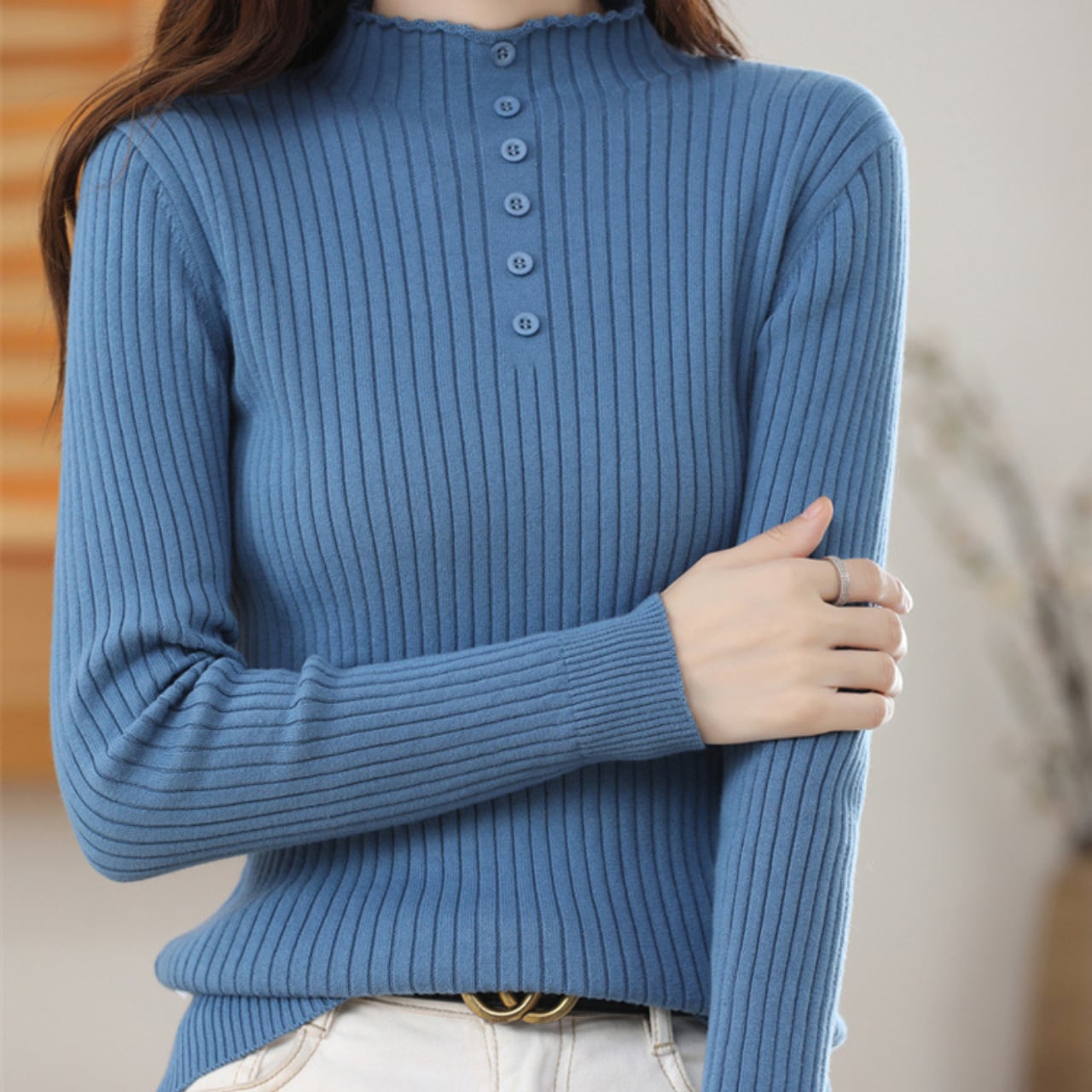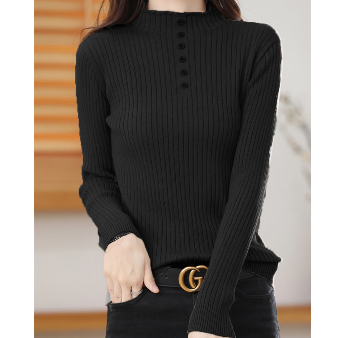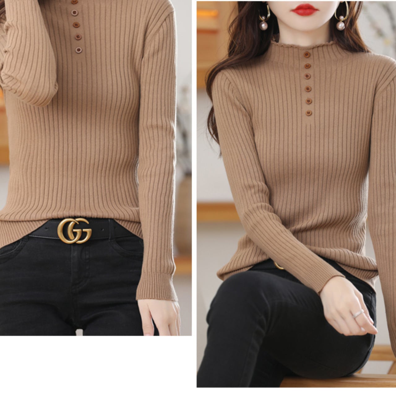シンプルなデザインの中に、リブ編みとフロントボタンが映えるニットトップス。