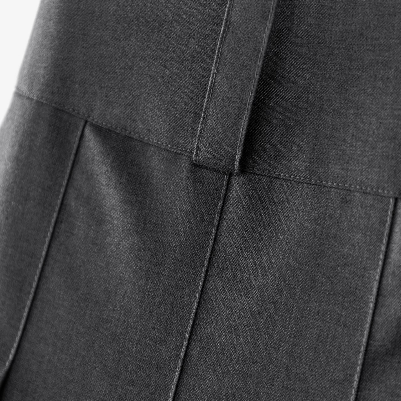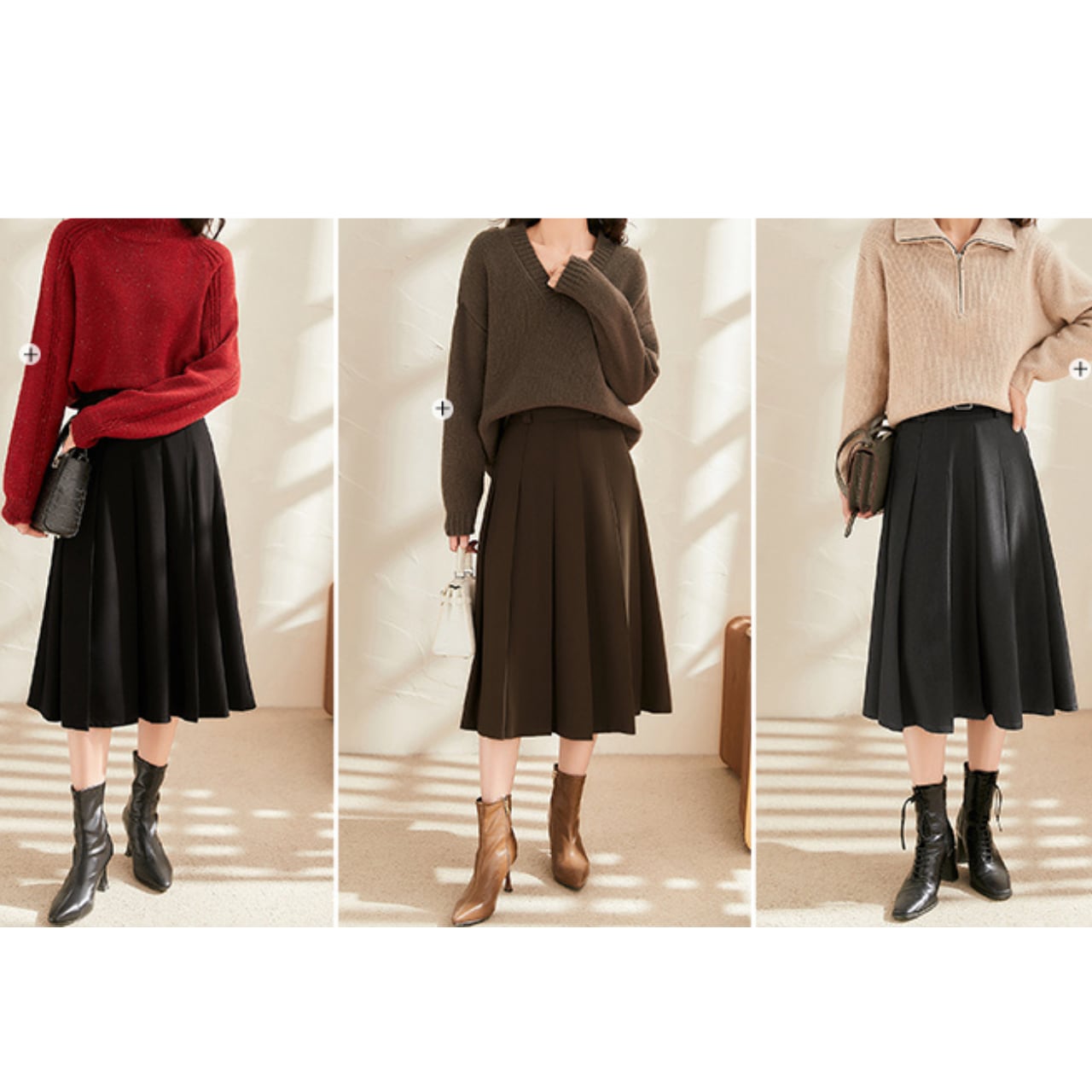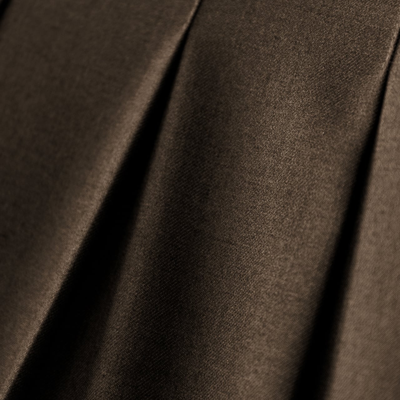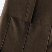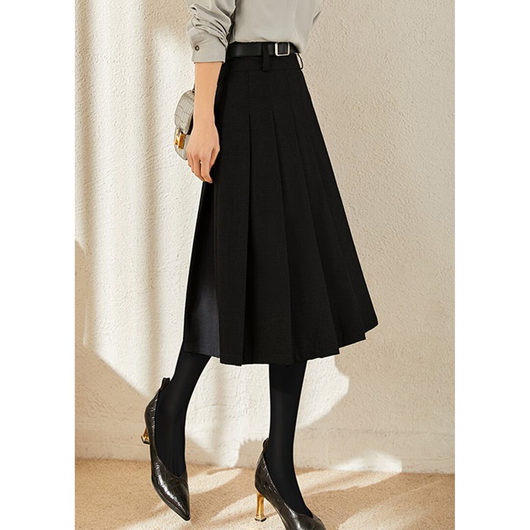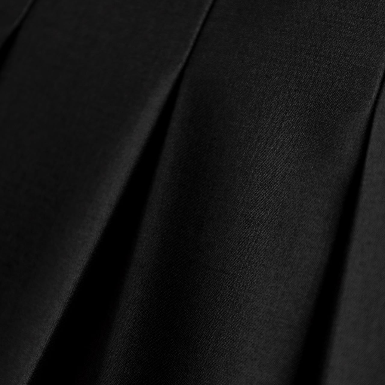ワイドプリーツと幅広にカットされたウエストベルト部分のデザインとAラインのシルエットが、縦長に細く魅せる効果が期待できます。