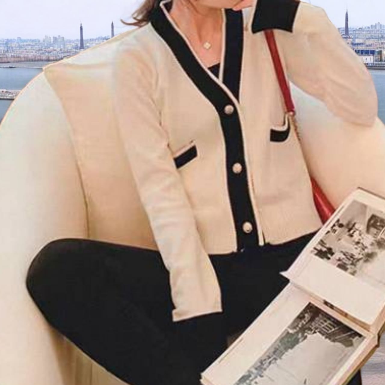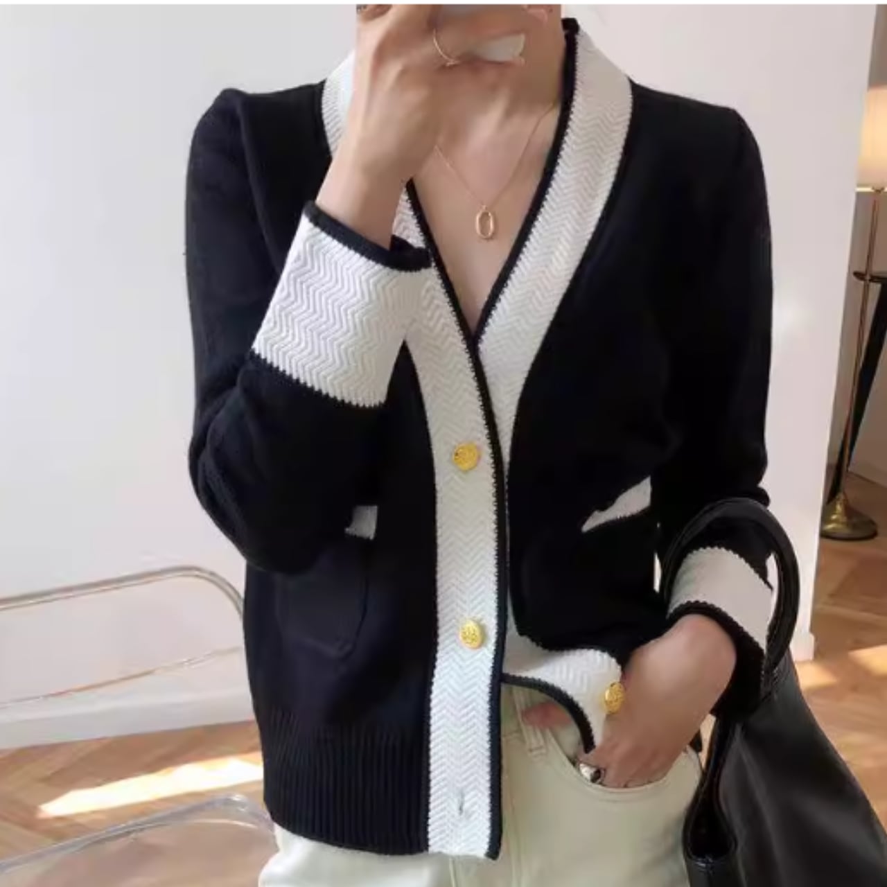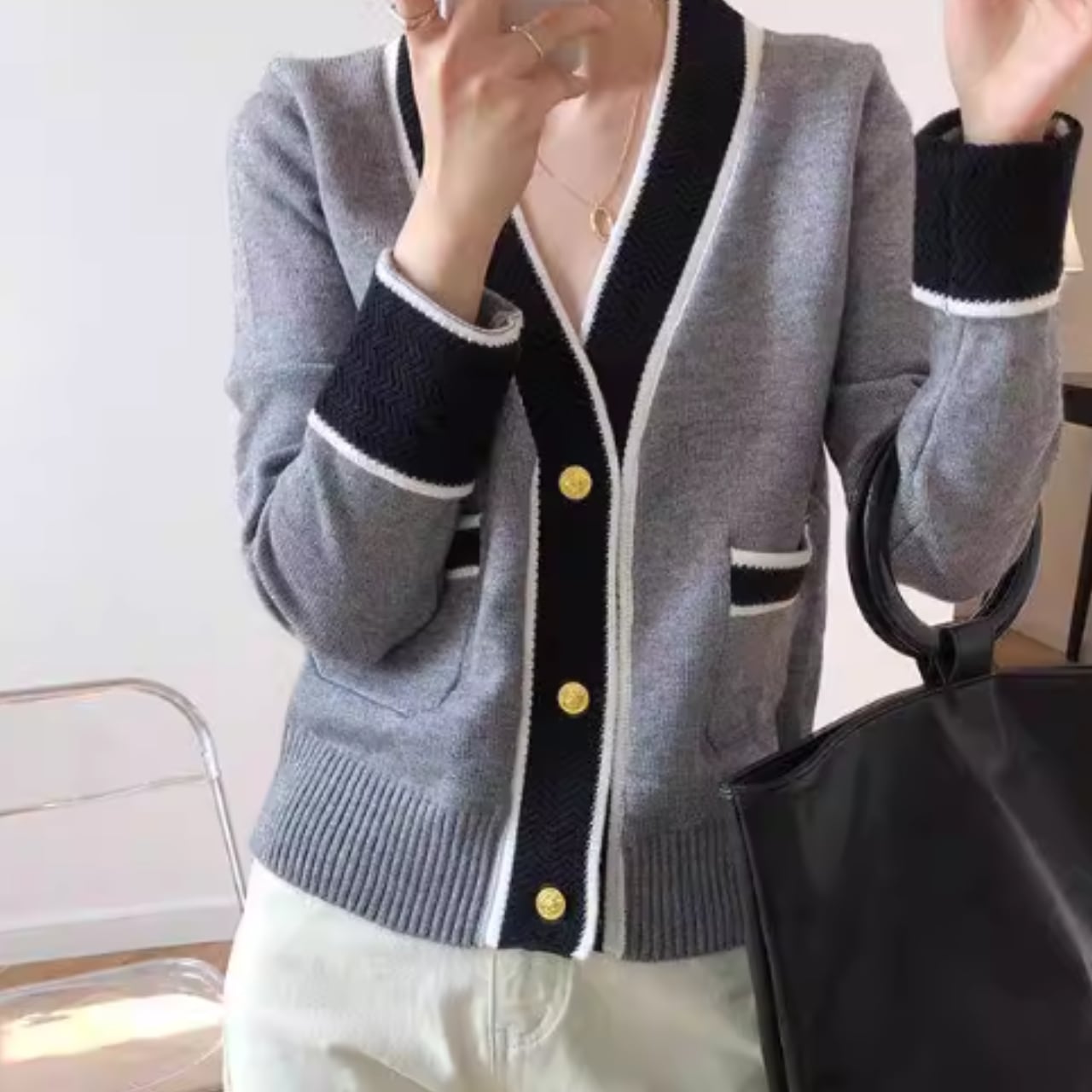 Vネックデザインが首元をすっきりと見せてくれるカーディガン。