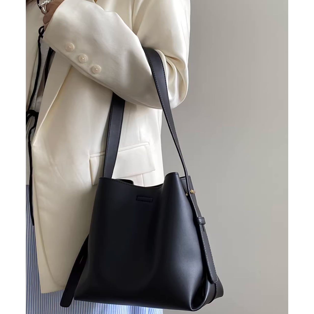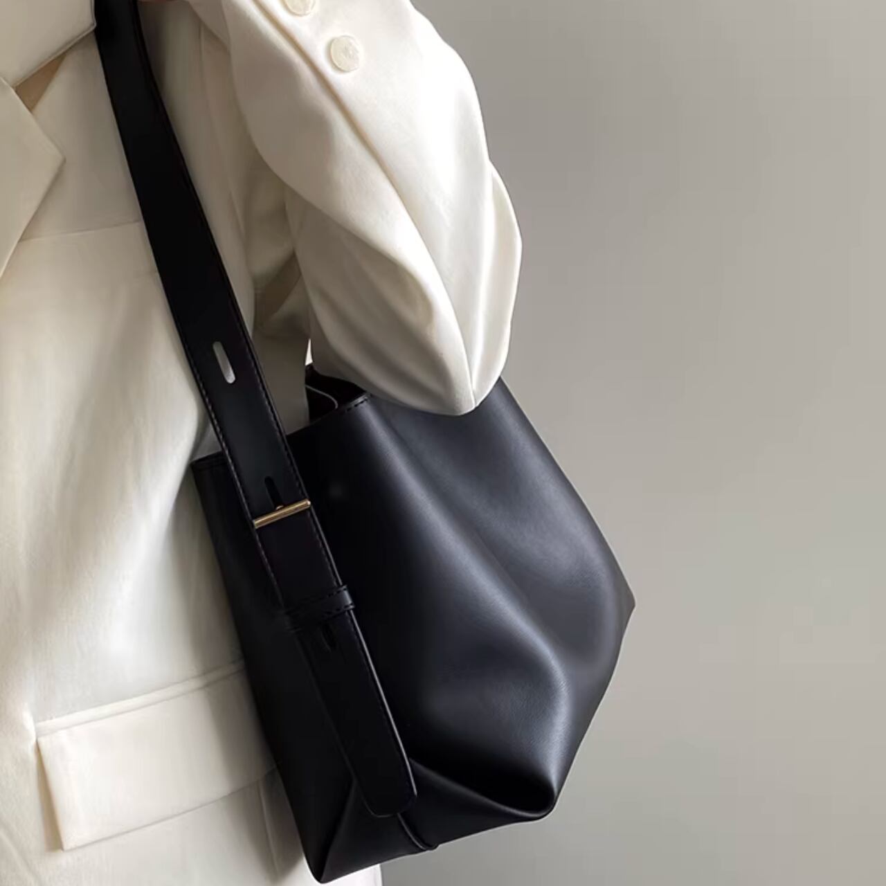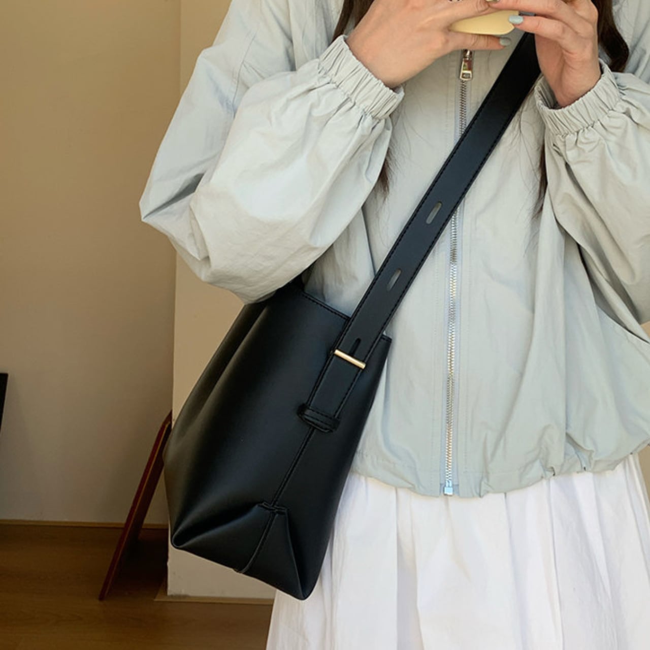シンプルでコーディネートの邪魔をしない、フェイクレザーのショルダーバッグ。