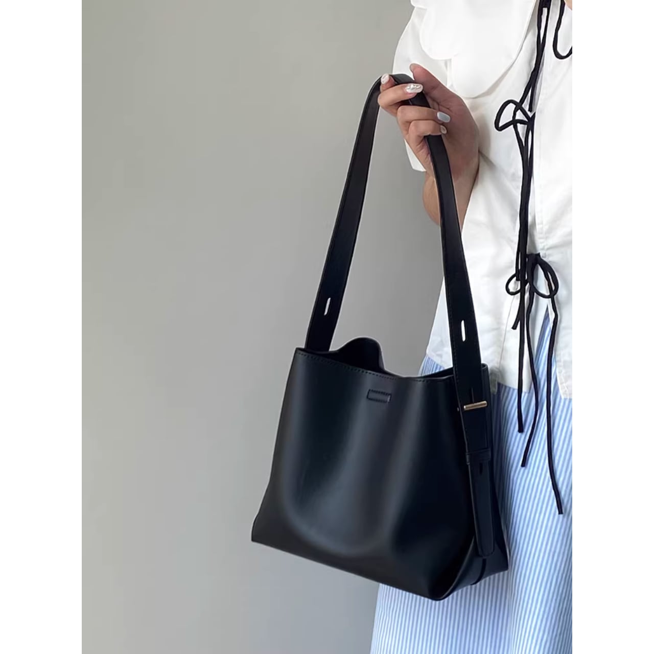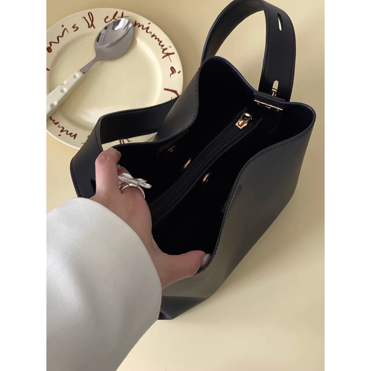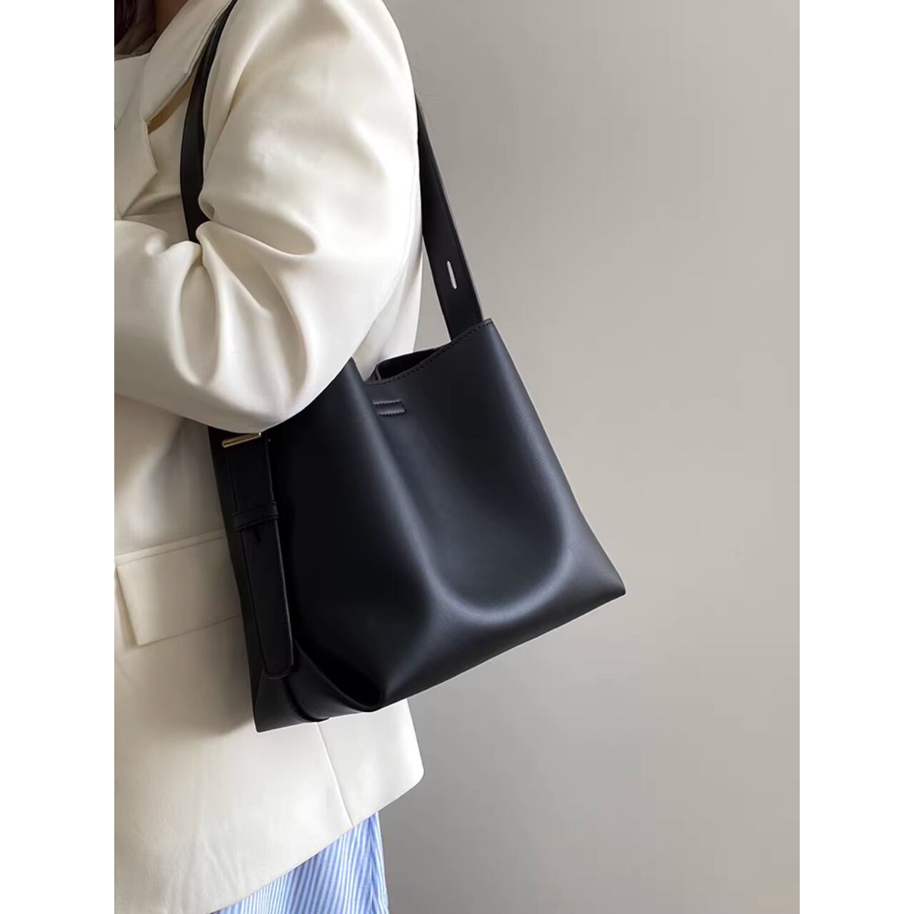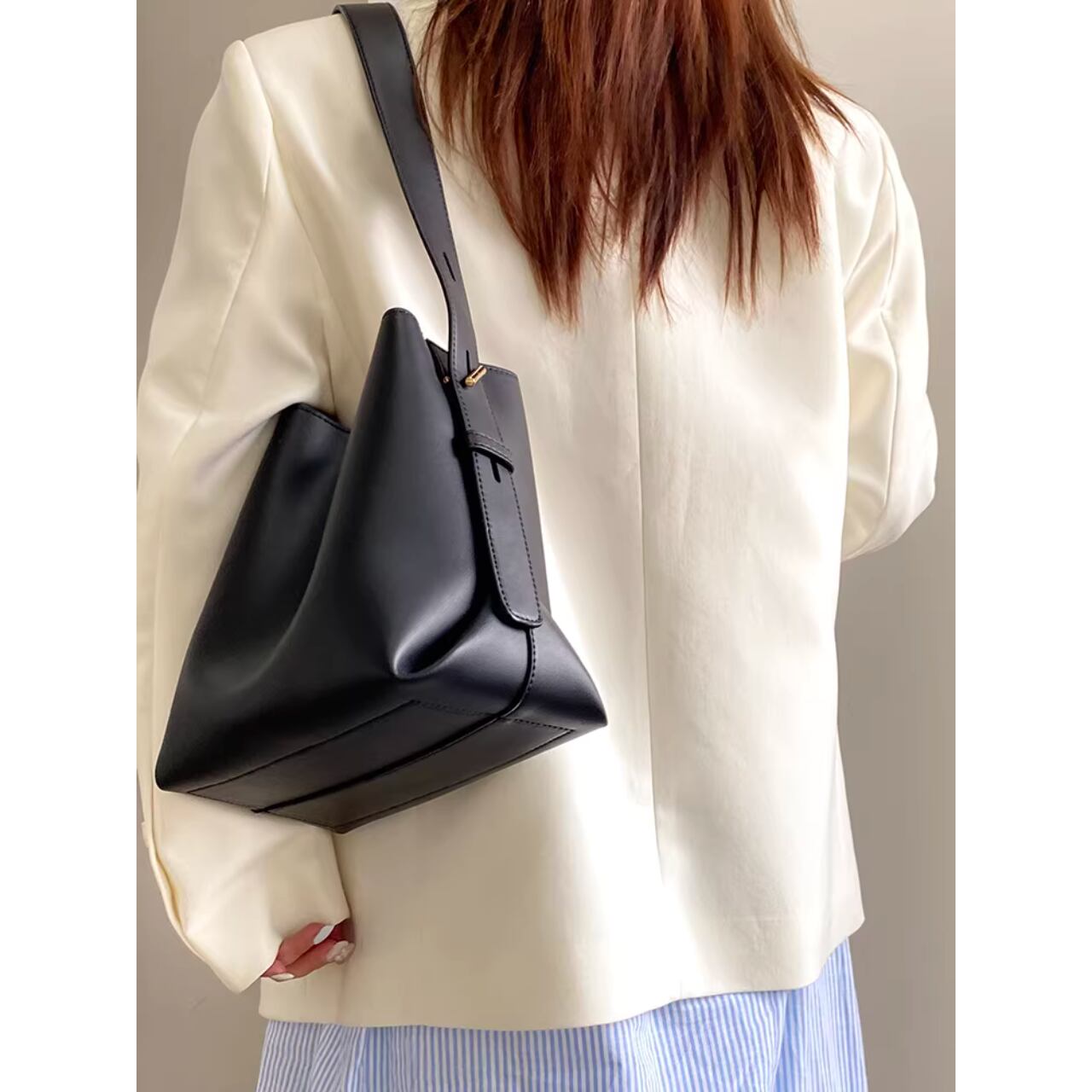 シンプルでコーディネートの邪魔をしない、フェイクレザーのショルダーバッグ。