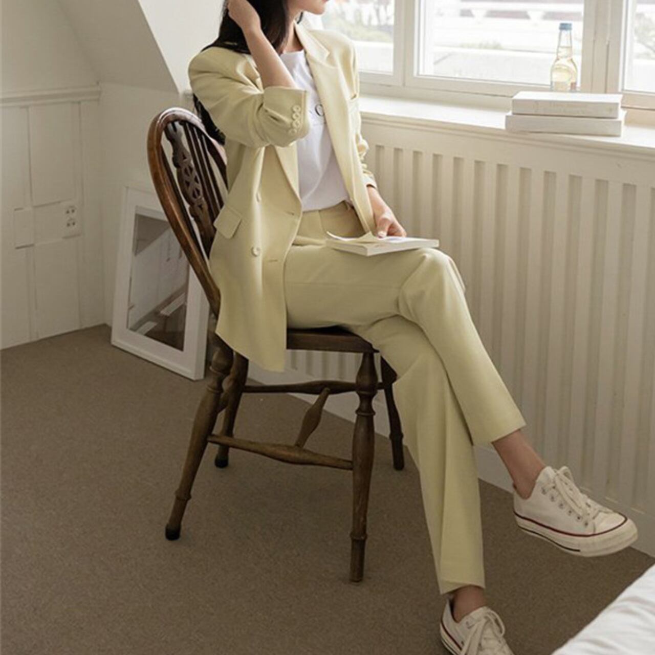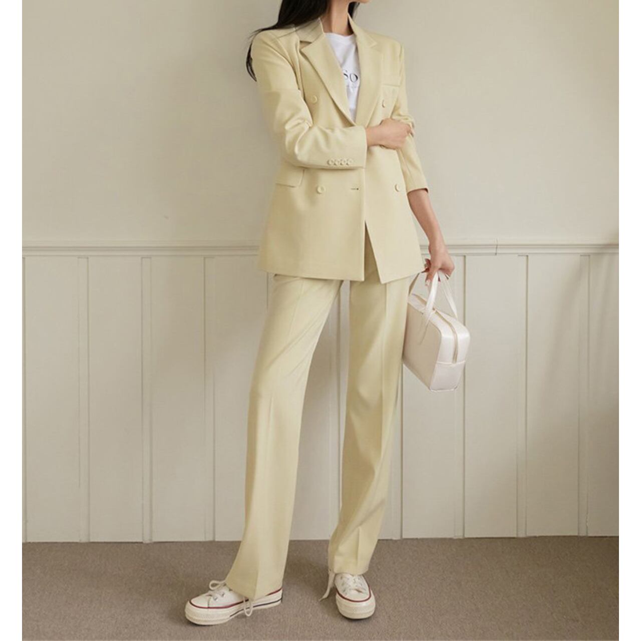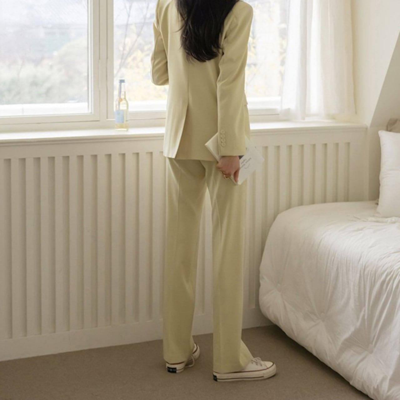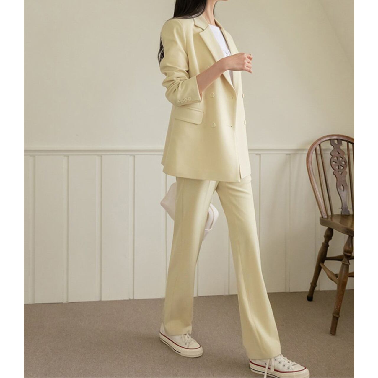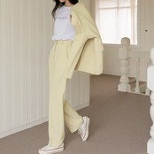 パンツはセンタープレス入りでほどよいワイドストレートが脚を細く長く魅せる効果も嬉しい。