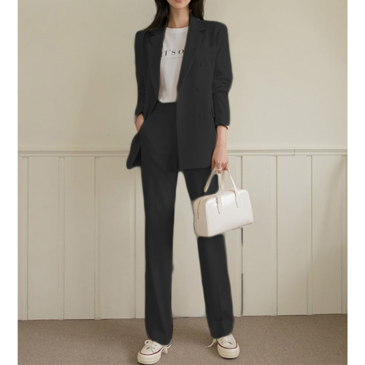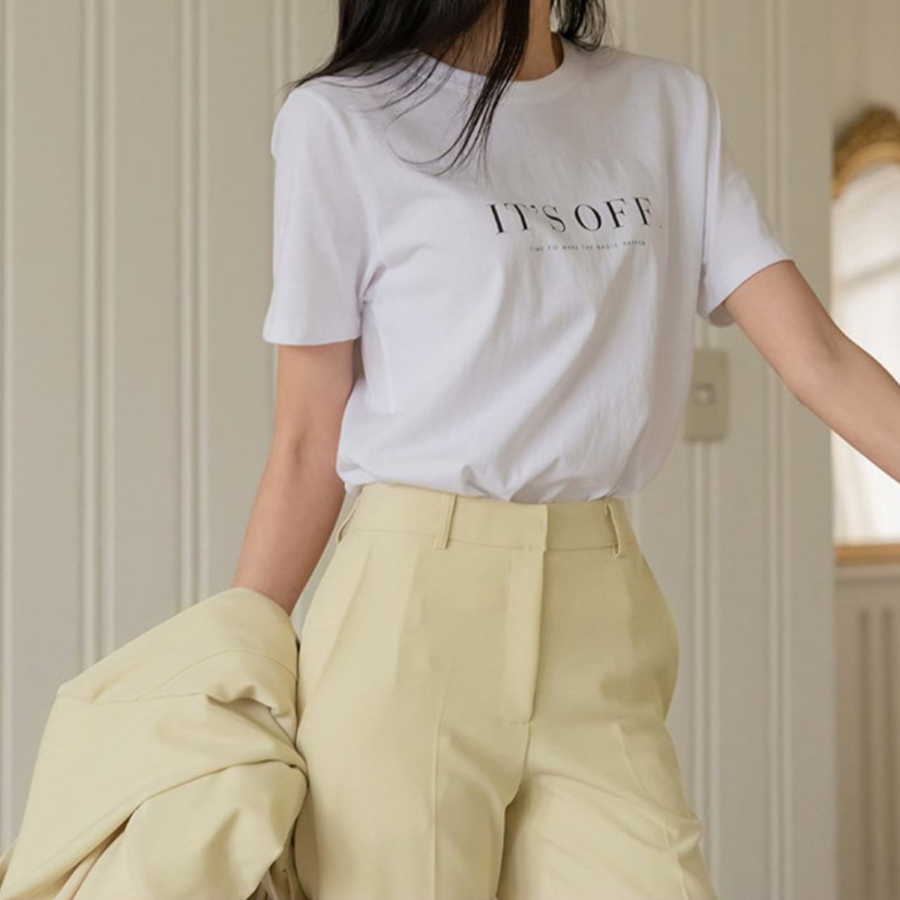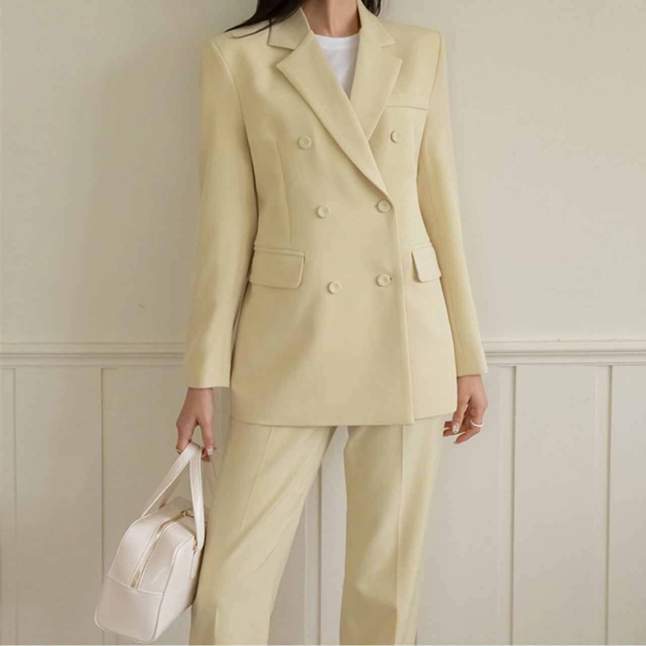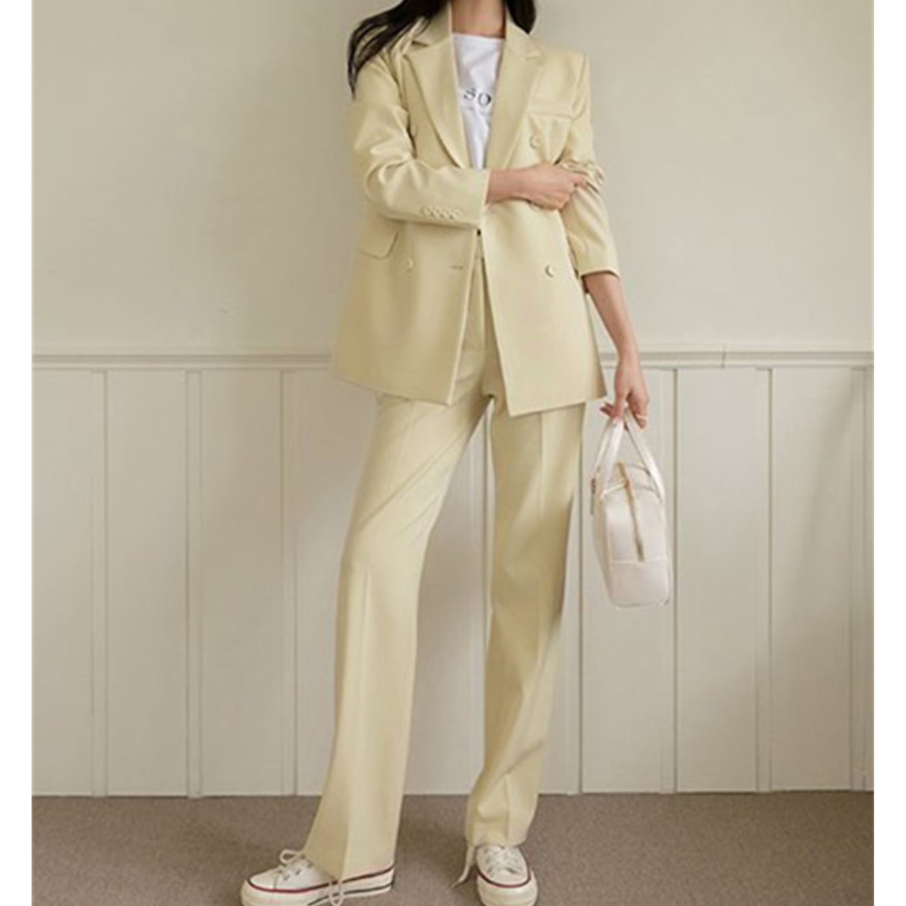 パンツはセンタープレス入りでほどよいワイドストレートが脚を細く長く魅せる効果も嬉しい。