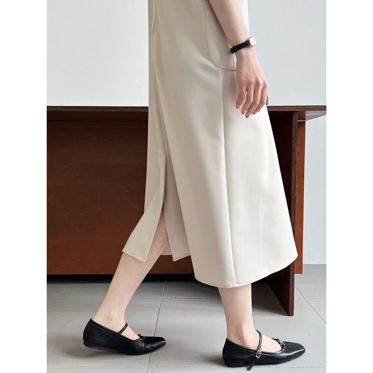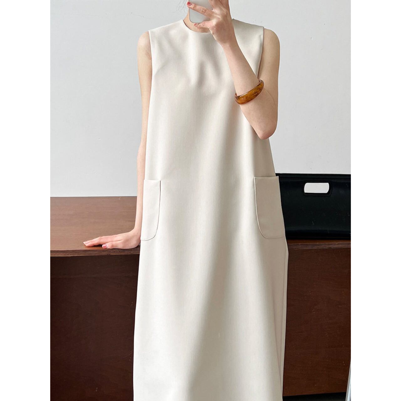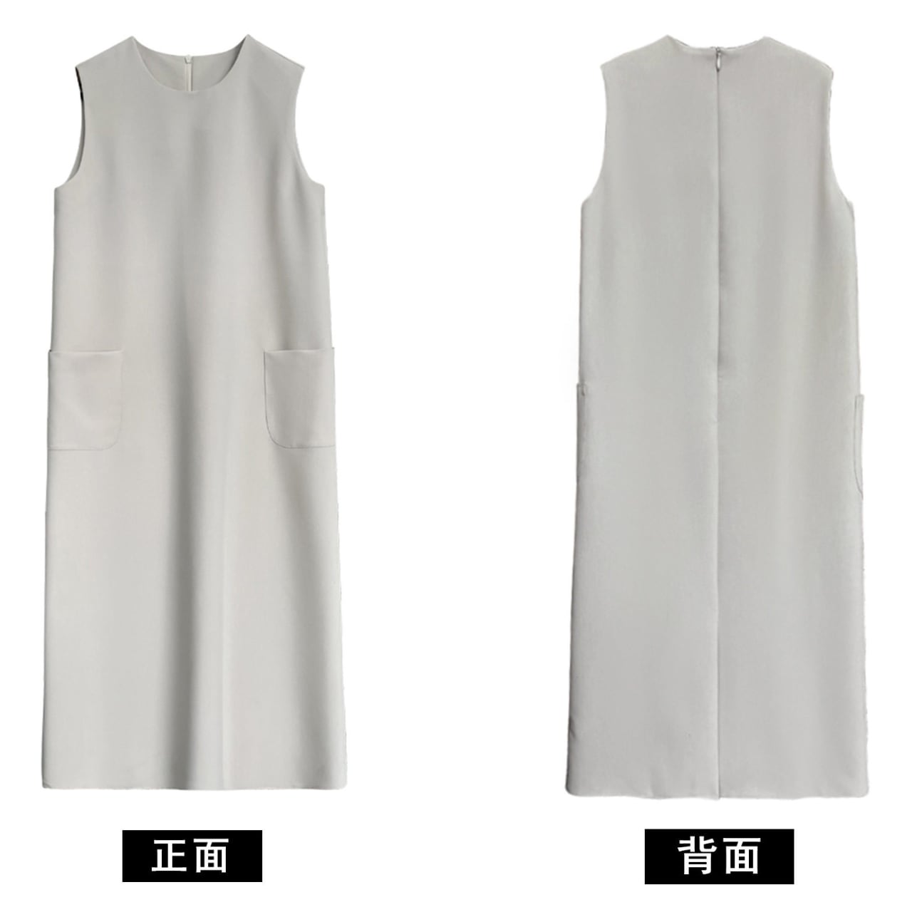 両サイドのパッチポケットがアクセントになったロング丈のワンピース。