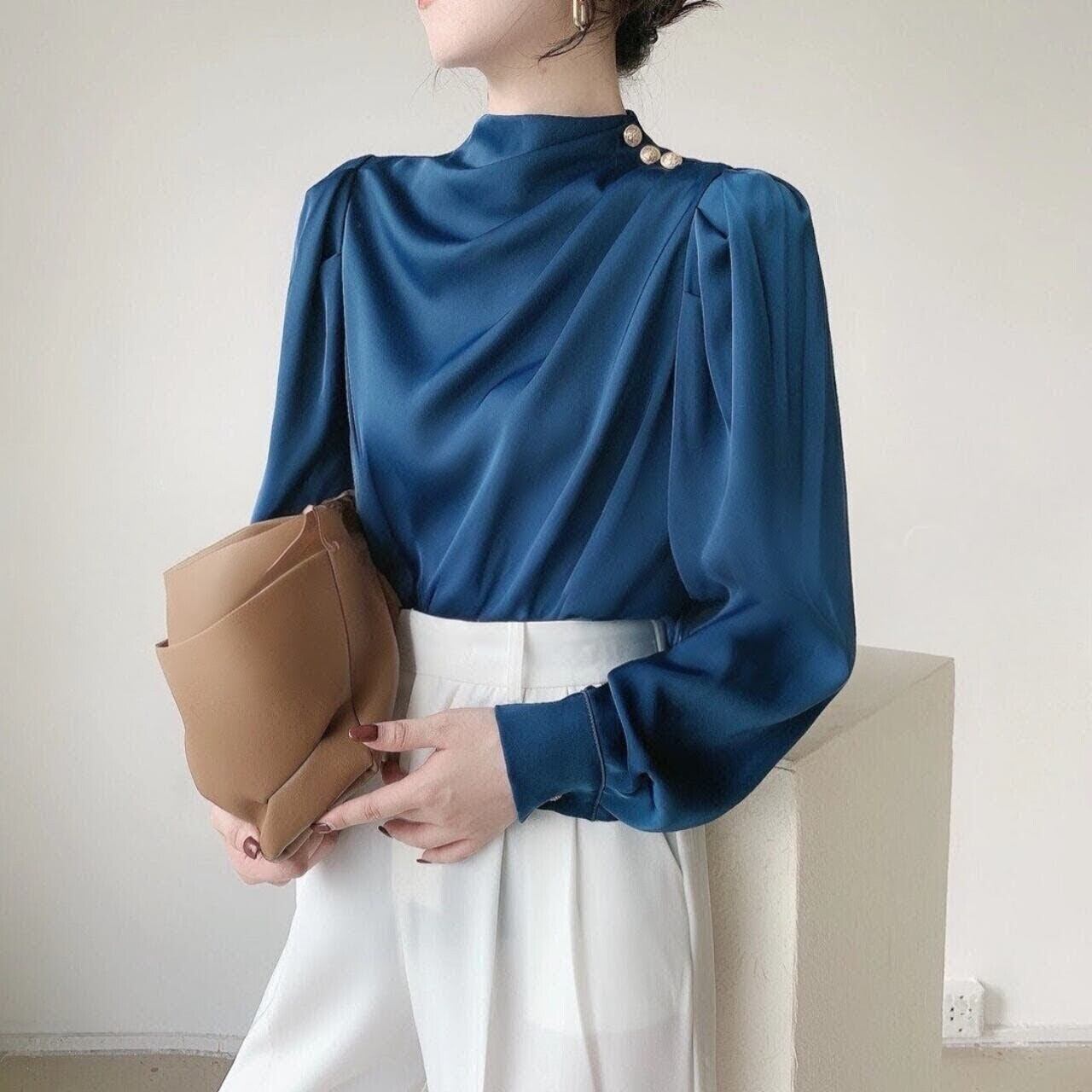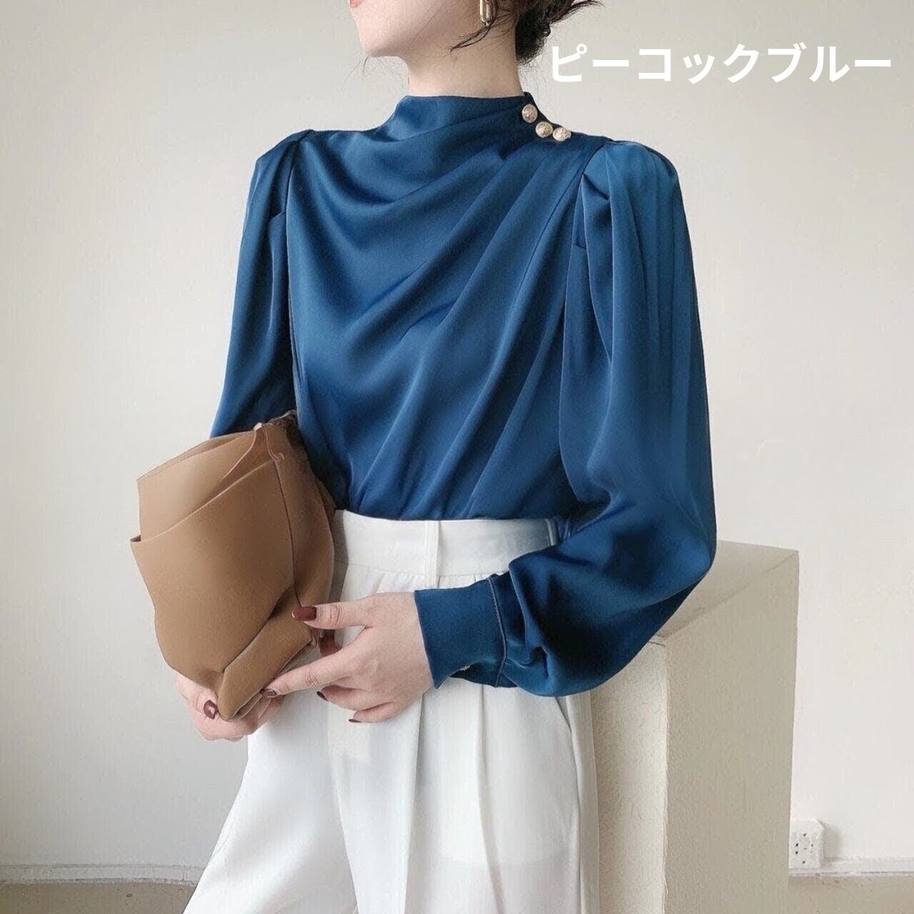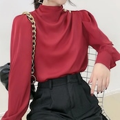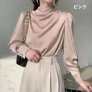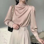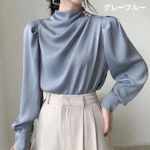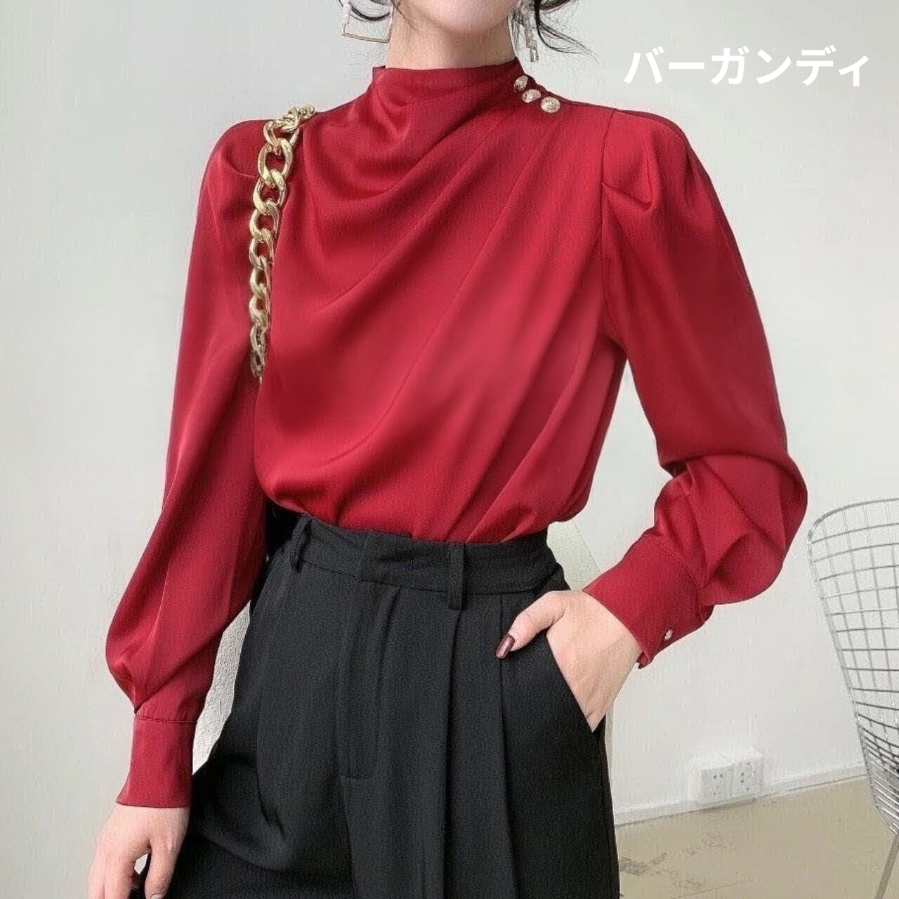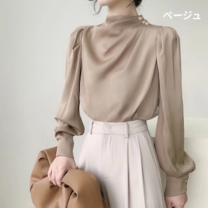 洗練された大人の女性にぴったりのサテンドレープスタンドカラーブラウス。