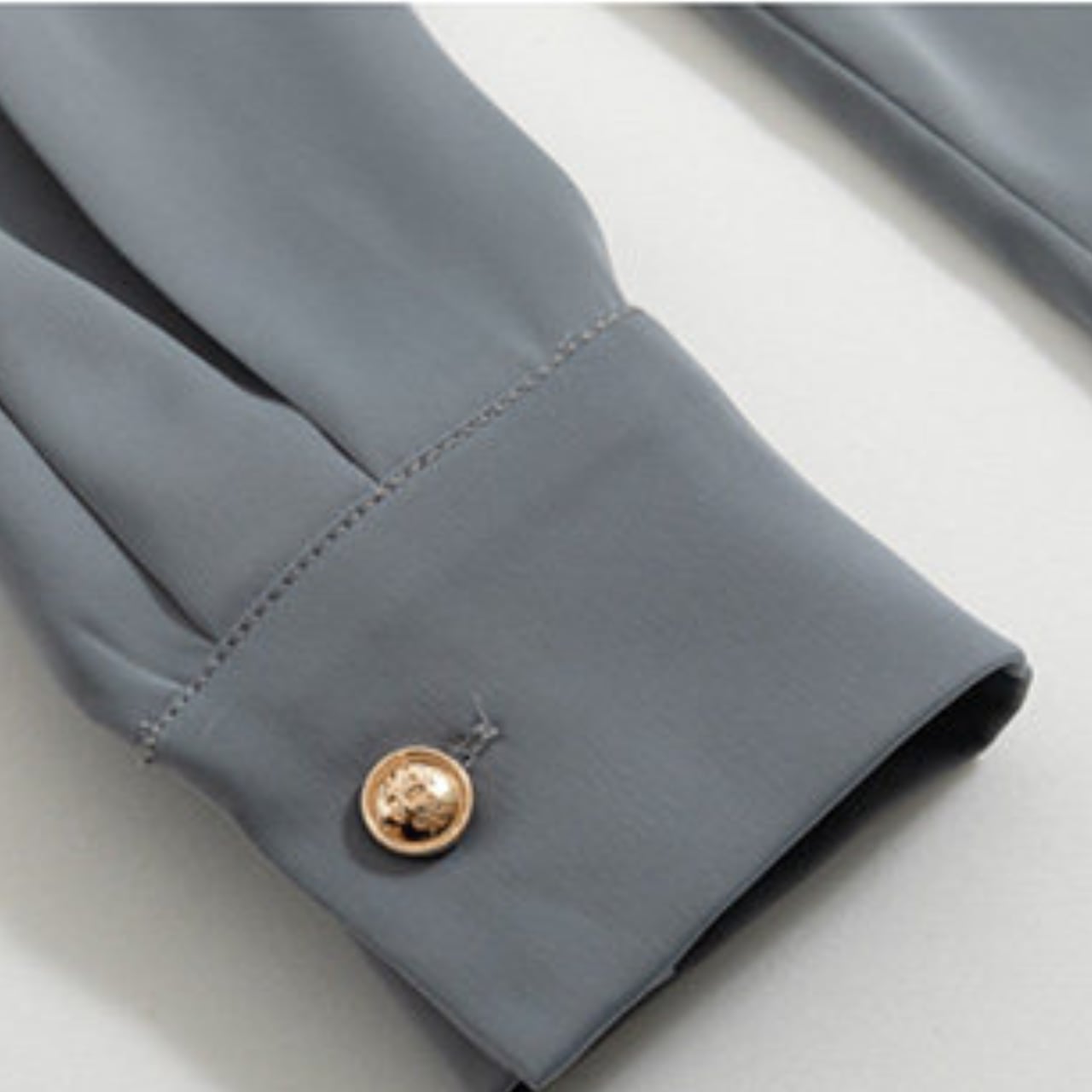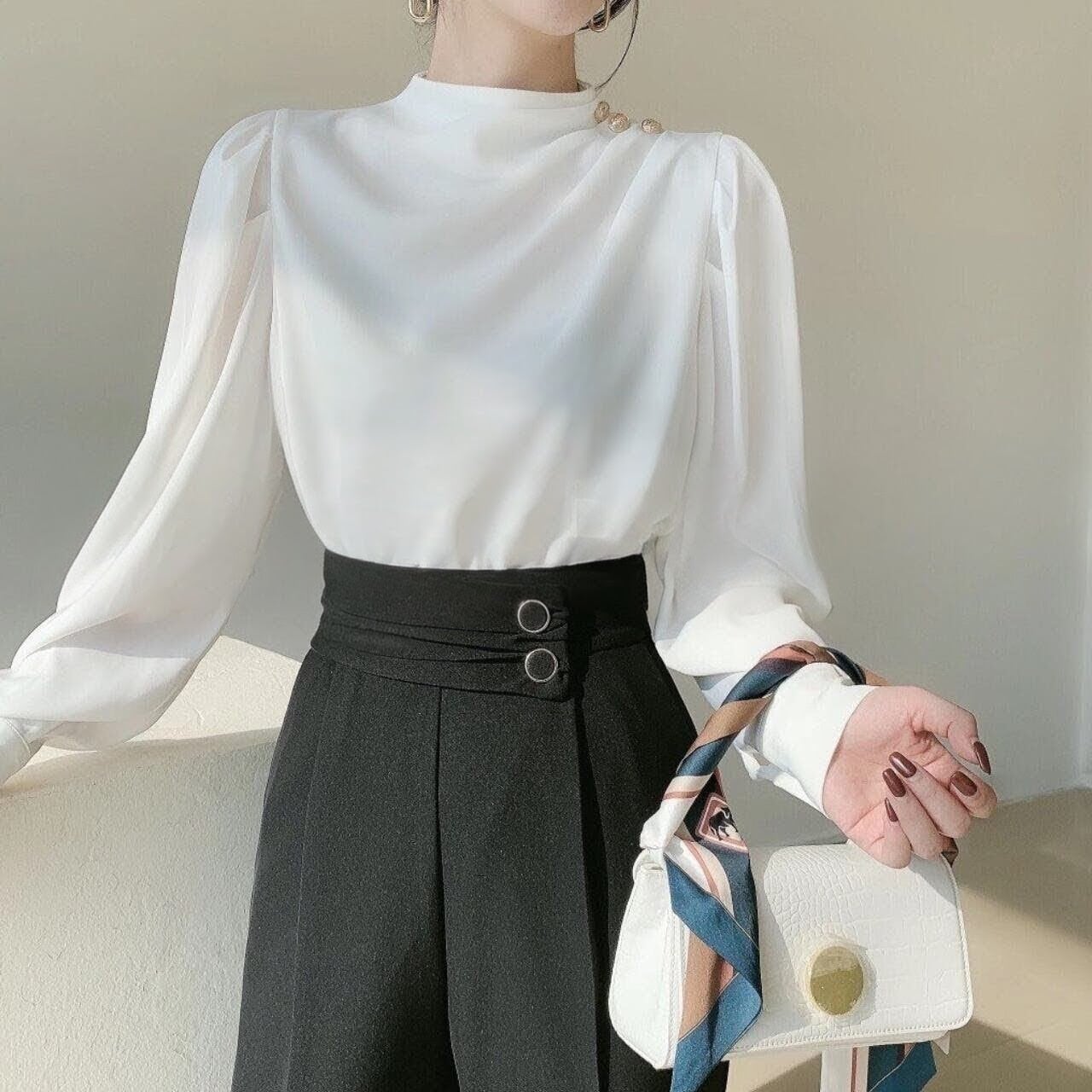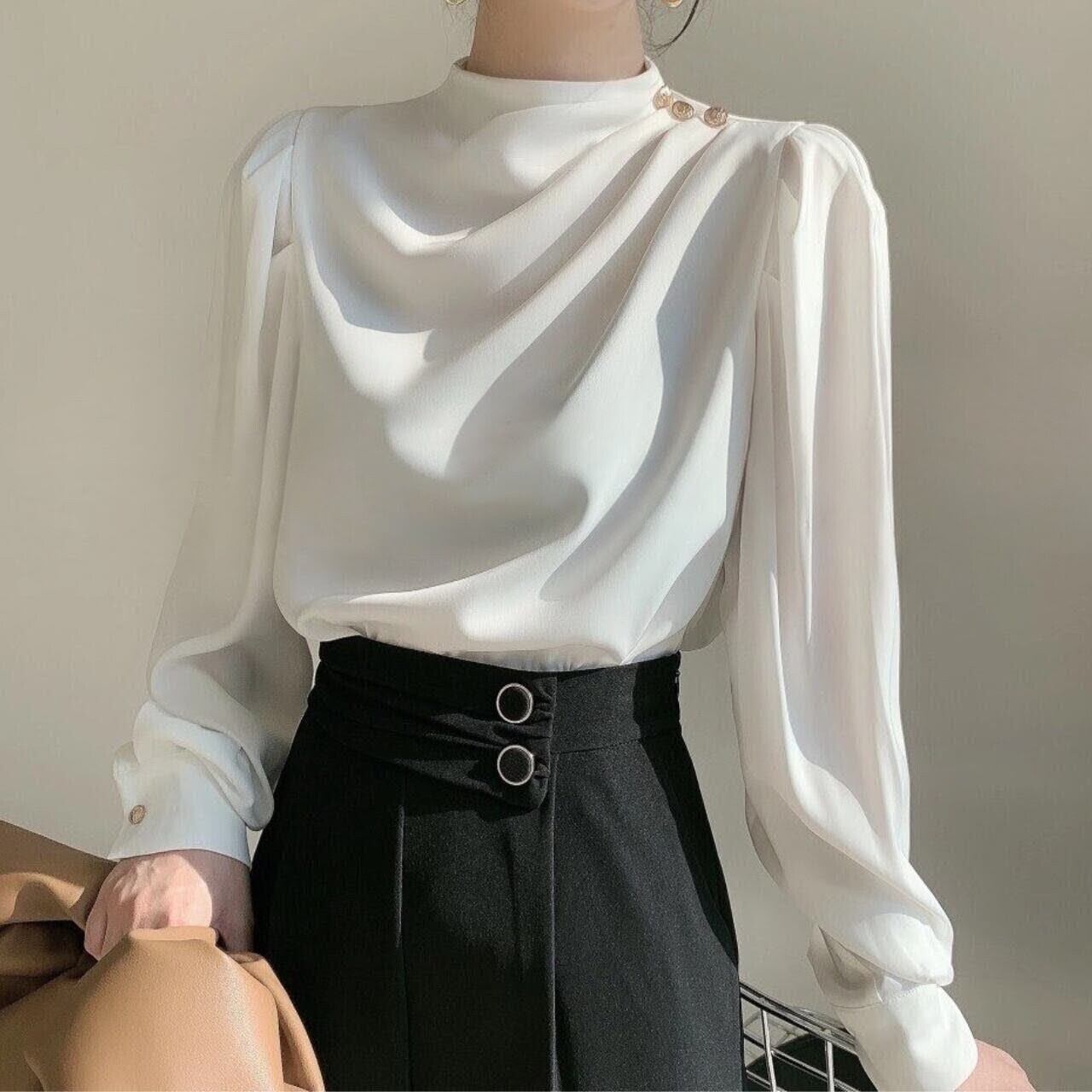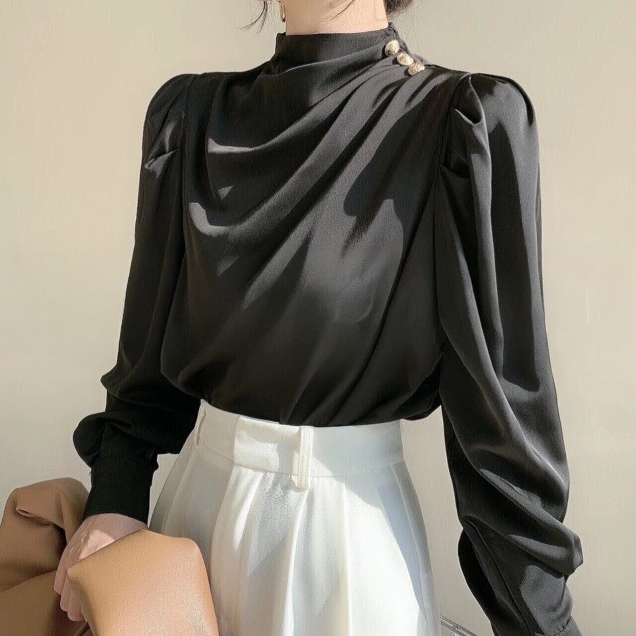 洗練された大人の女性にぴったりのサテンドレープスタンドカラーブラウス。