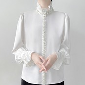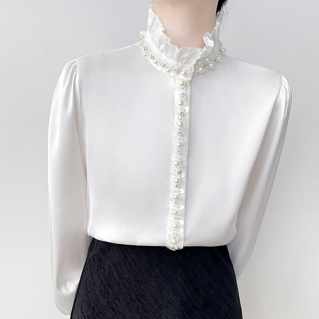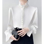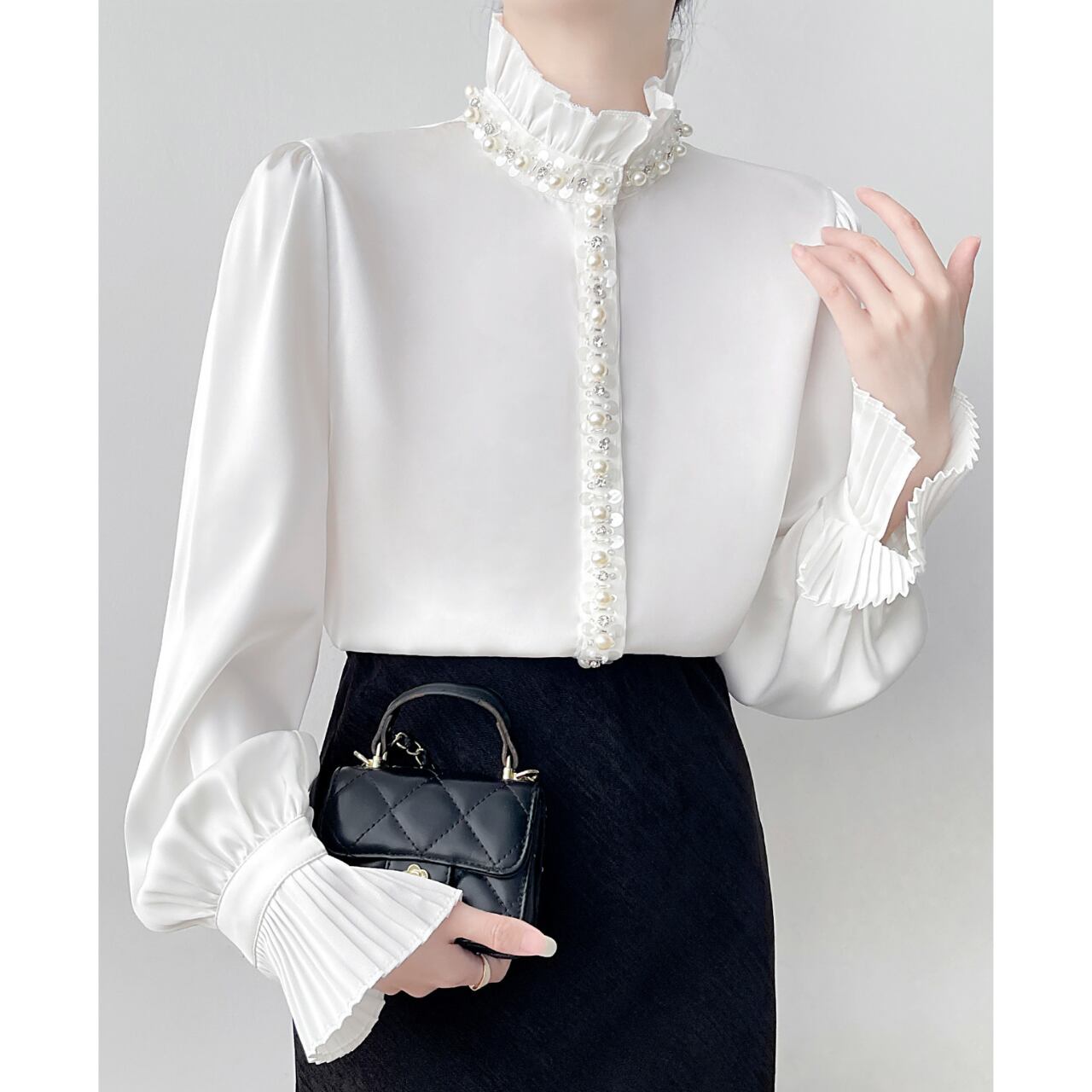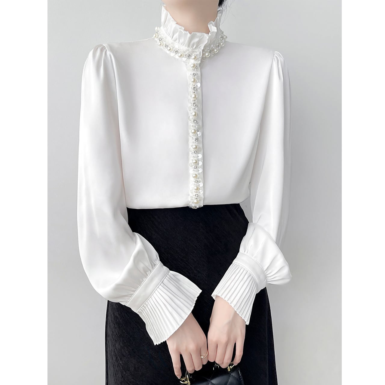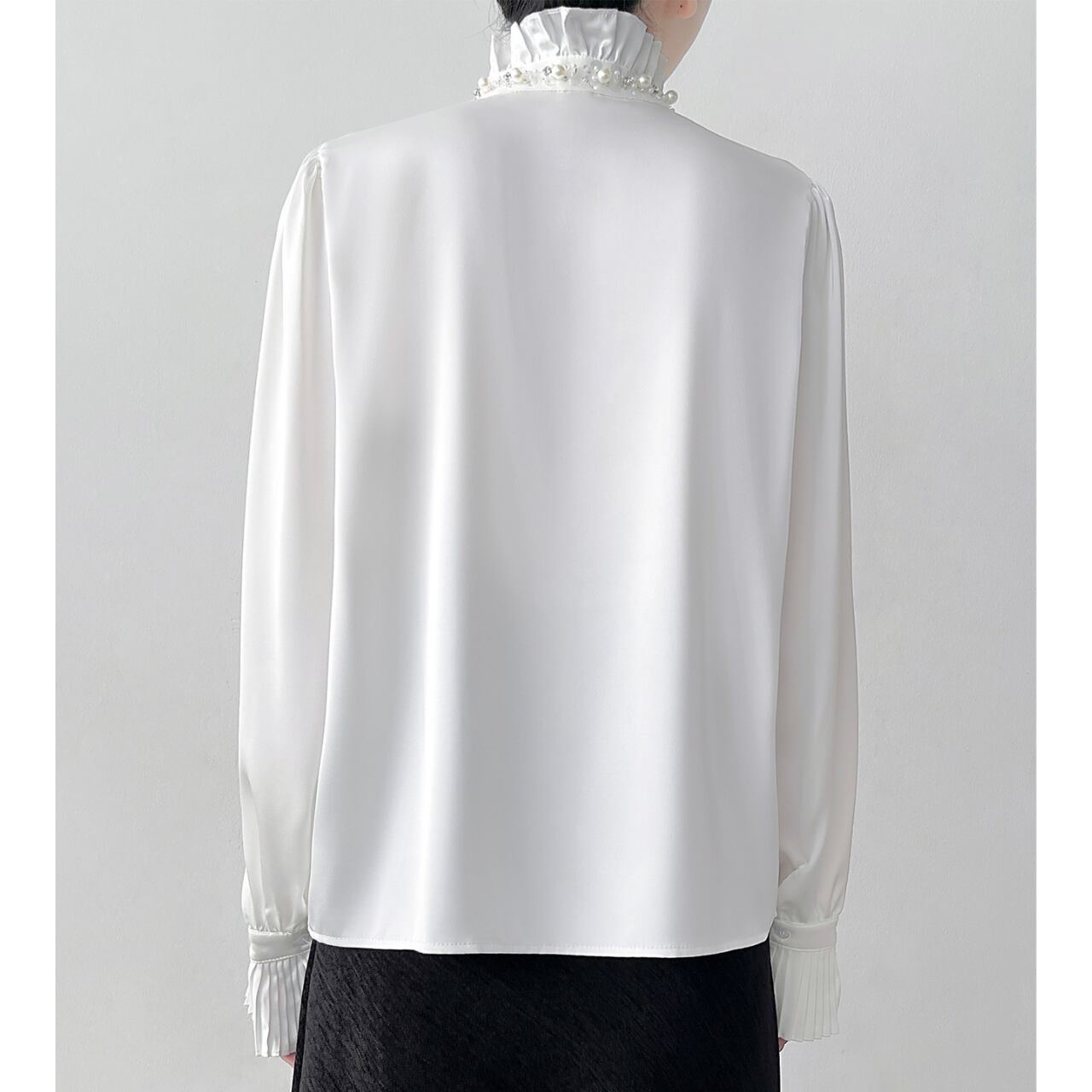 フリルカラーとパール装飾が顔周りを華やかに演出し、袖プリーツで上品な雰囲気を高めます。