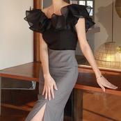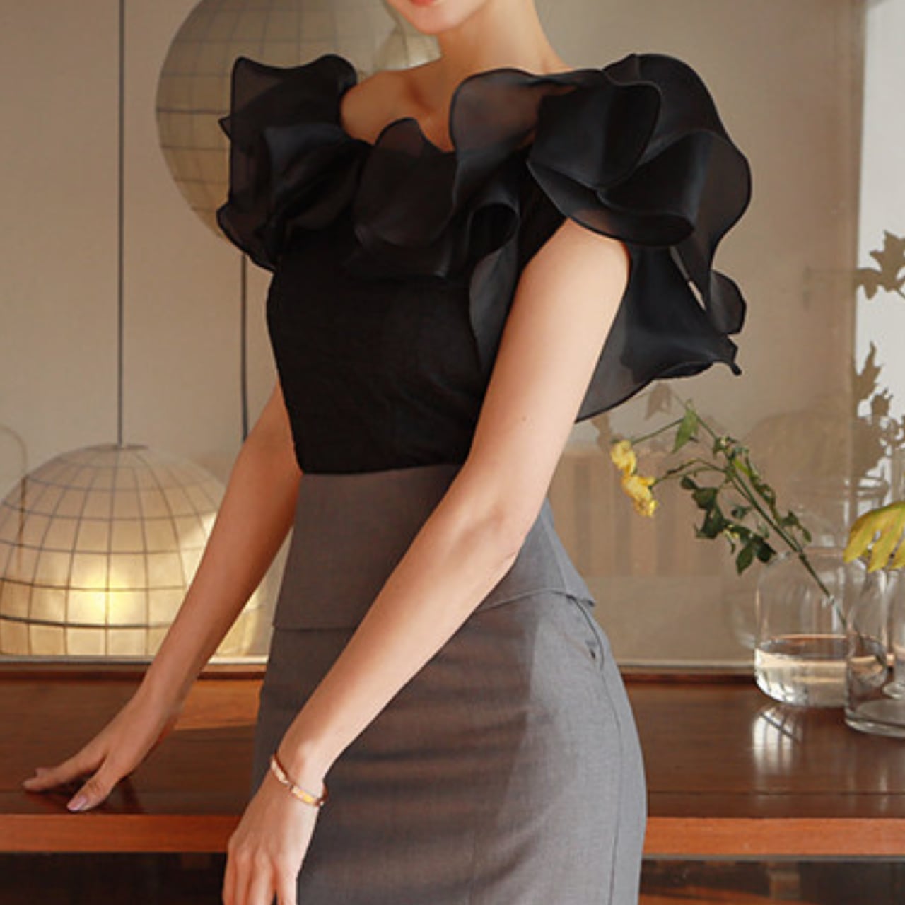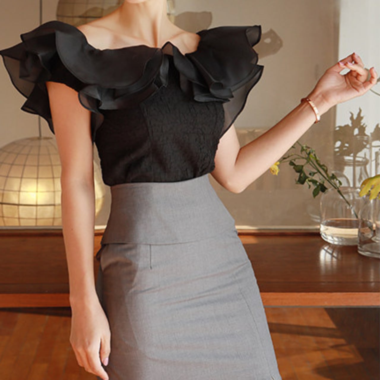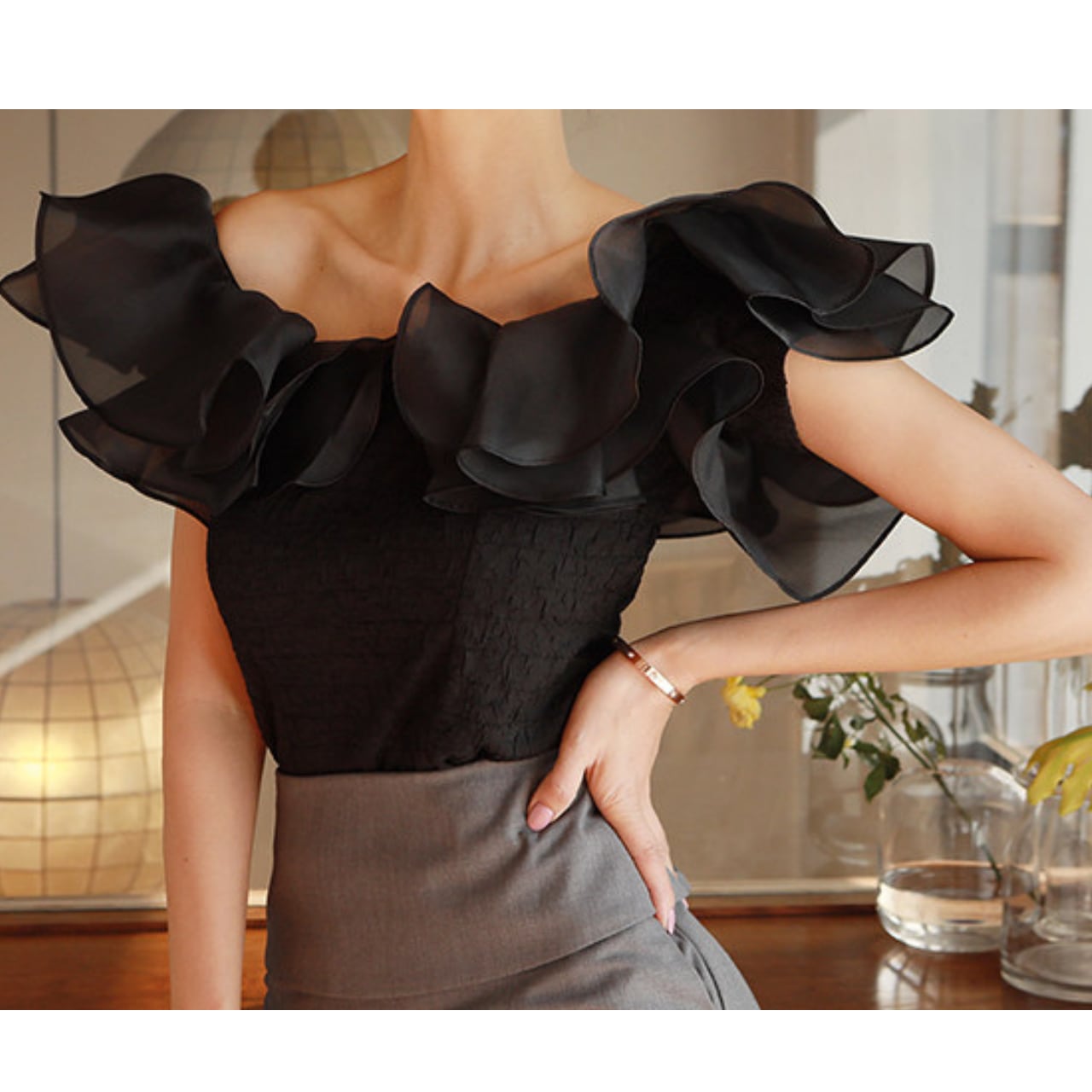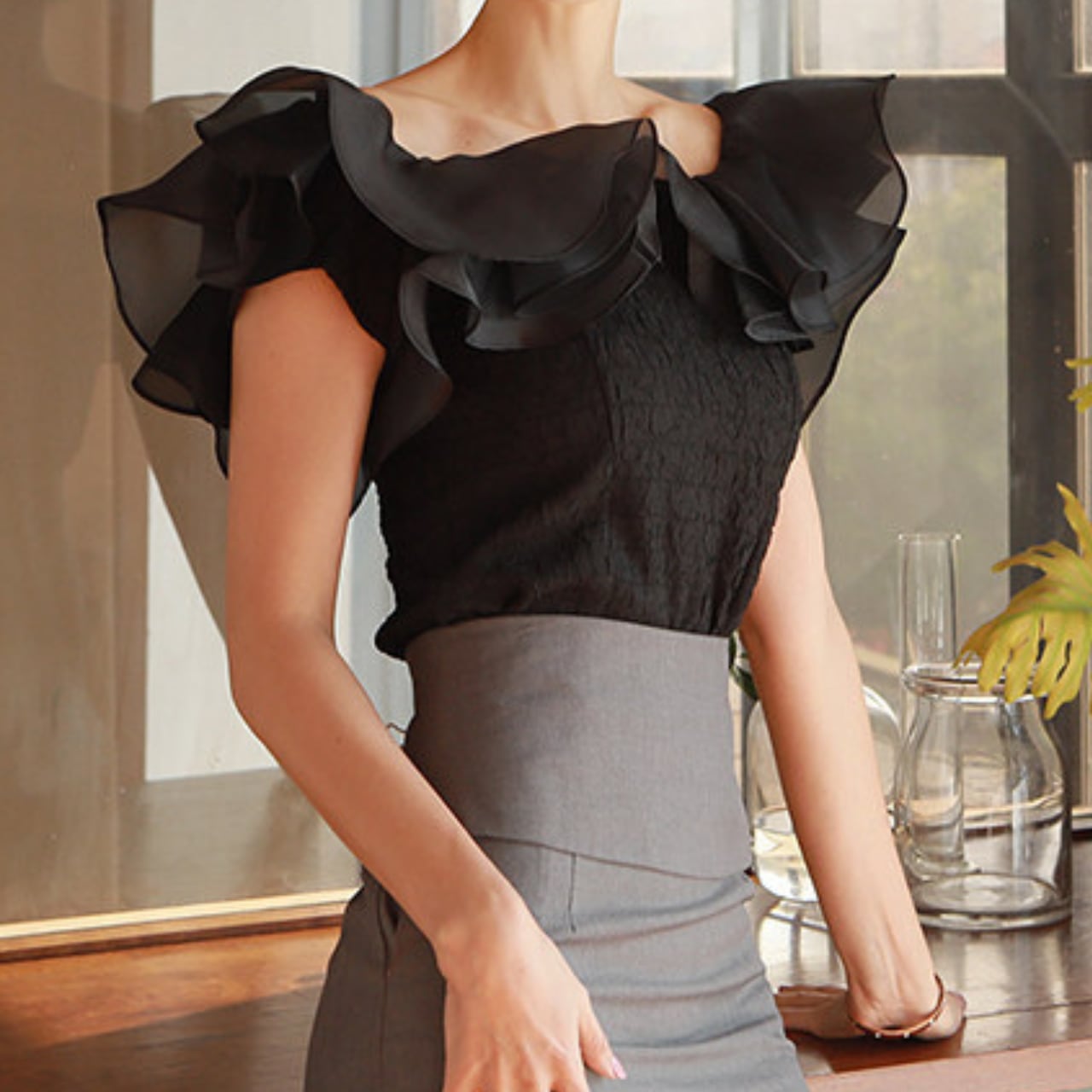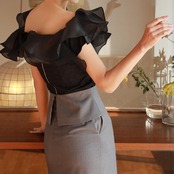 肩のフリルが華やかな印象を与えるブラウス。